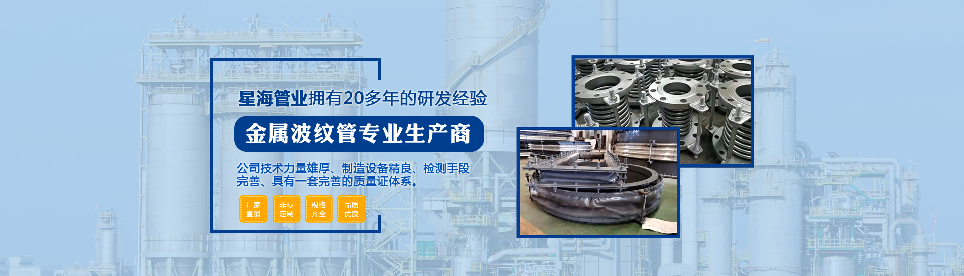 泰州市星海管業(yè)有限公司座落于風(fēng)景如畫(huà)的江蘇魚(yú)米之鄉(xiāng),是一家專業(yè)生產(chǎn)金屬波紋管的高新企業(yè)。本公司技術(shù)力量雄厚、制造設(shè)備精良、檢測(cè)手段完善、具有一套完善的質(zhì)量證體系,系列產(chǎn)品齊全、質(zhì)量可靠、價(jià)格合理,深受廣大用戶的信賴和好評(píng)。主導(dǎo)產(chǎn)品是金屬波紋膨脹節(jié),不銹鋼金屬軟管,滑動(dòng)式伸縮節(jié),填料函式伸縮節(jié),橡膠補(bǔ)償接頭,各種型號(hào)彈性吊架...
